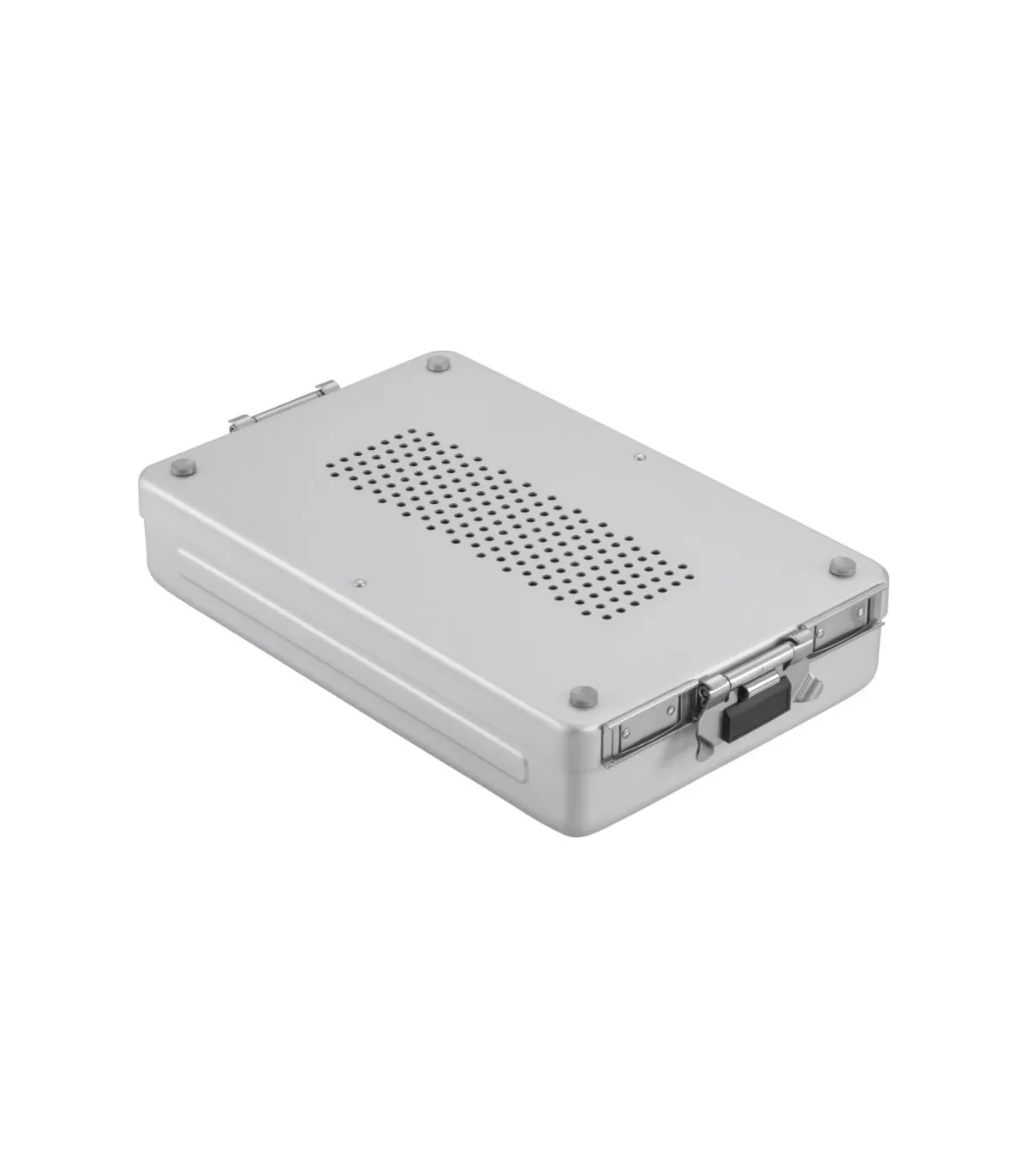 Container sterilizare cu baza perforata, dimensiune exterioara 312 x 190 x 46 mm.