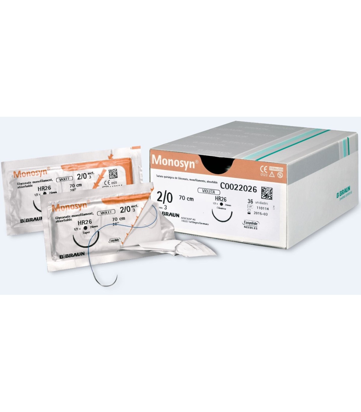 MONOSYN - FIR DE SUTURA RESORBABIL, VIOLET, ABSORBTIE TERMEN MEDIU, MONOFILAMENT, GLICONAT, 2/0 USP (3 EP), L=70 CM, AC ROTUND, STANDARD, CURBURA 5/8, 26 MM, 36 FIRE/CUTIETermen valabilitate: 05.12.2024