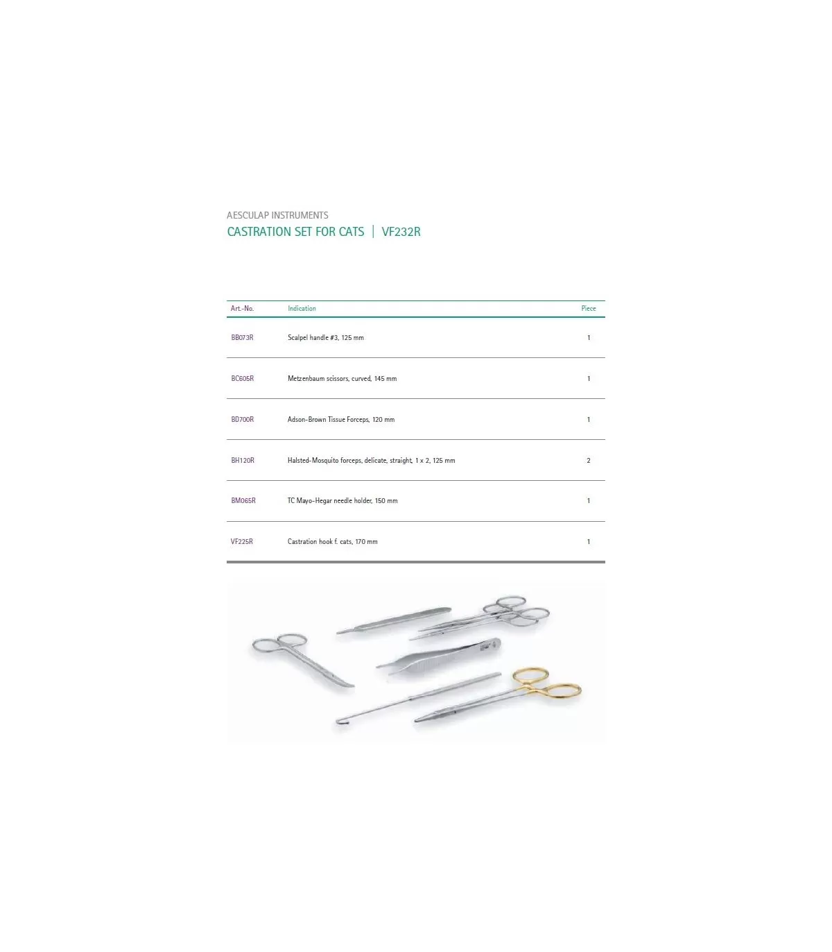 Set instrumentar chirurgical veterinar pentru castrare feline, compus din 7 instrumente: